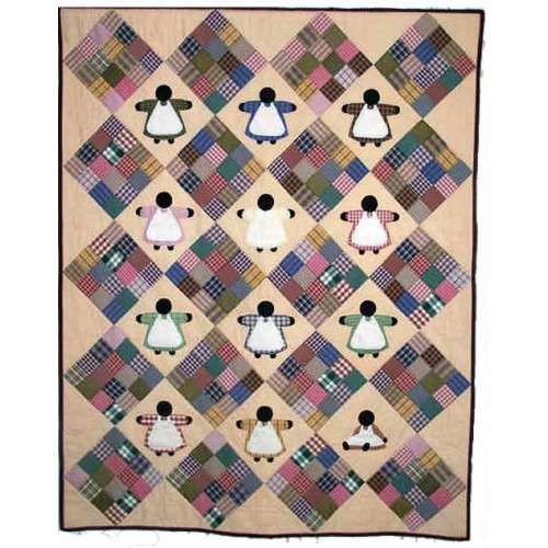 This single bed quilt comprises 12 blanket stitched gollidolls alternating with patchwork blocks.