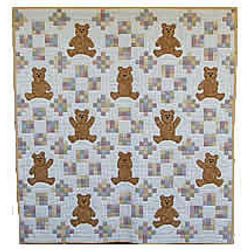This child's quilt is constructed using two main blocks - a pieced 9 patch block and a pieced appliqued block, using blanket stitch technique.